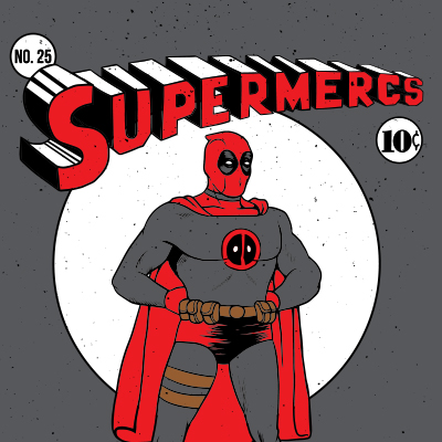 "Supermercs" is a t-shirt design that illustrates a parody from Superman and Deadpool comics.