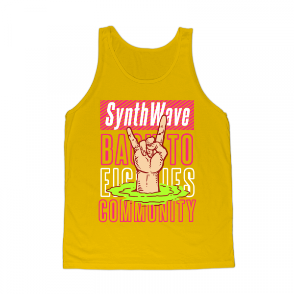 Vector illustration of metal hand sign with 80s colors palette. Ready to print on t-shirt.