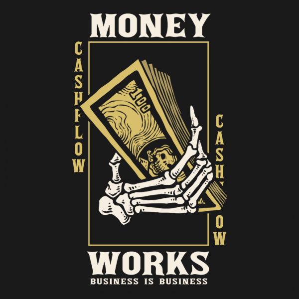 Vector illustration of skull hand holding cash money for business. Ready to print on t-shirt.