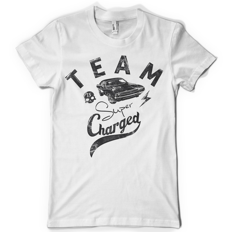 Team Super Charged graphic design template in vector format, featuring detailed retro car now available for Adobe Illustrator, Adobe Photoshop and Corel Draw and can be used for digital printing and screenprinting .