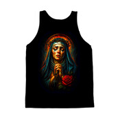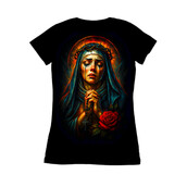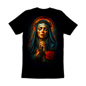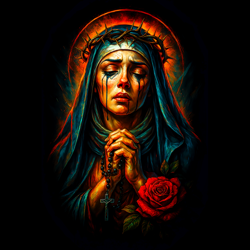 This artwork depicts the Virgin Mary in a state of profound sorrow, her face etched with grief as tears stream down her cheeks. She wears a crown of thorns, symbolizing suffering and sacrifice, and her hands are clasped in prayer, holding a rosary. A vibrant red rose lies at the bottom, a symbol of love and martyrdom. The color palette is rich and dramatic, with deep blues and reds contrasting against a dark background, enhancing the emotional intensity of the scene. The style blends traditional religious iconography with a modern, almost painterly aesthetic, creating a powerful and evocative image. Designers could use this image for religious-themed projects, such as prayer cards, memorial art, or church publications. It would also be suitable for creating emotionally resonant designs for grief support materials or as a poignant element in artistic compositions exploring themes of suffering and redemption. The striking visuals would make it stand out.