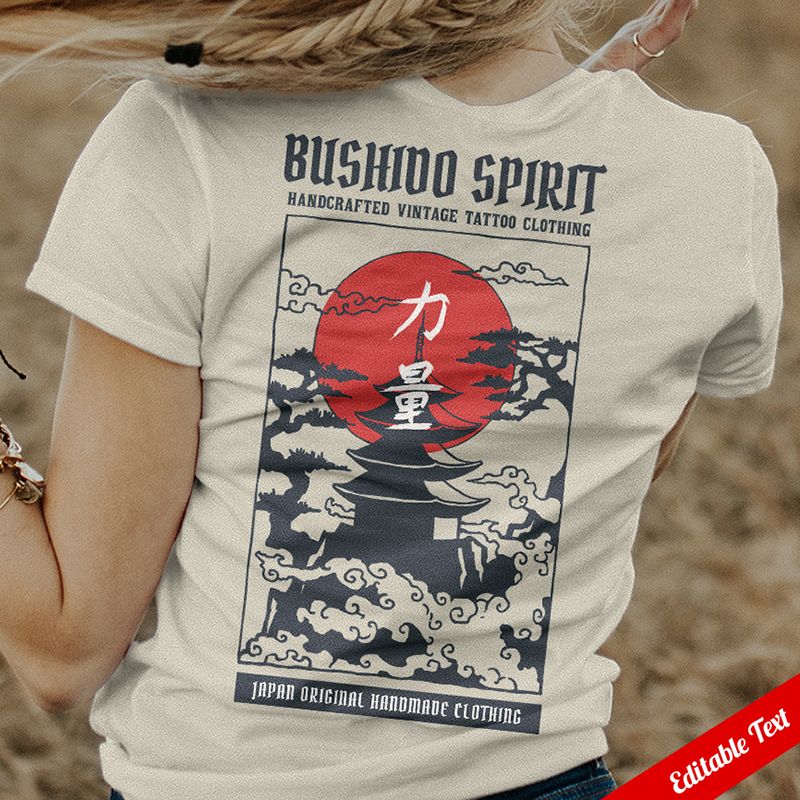 Vector illustration of japanese temple with landscape background and sunrise . Ready to print on t-shirt.