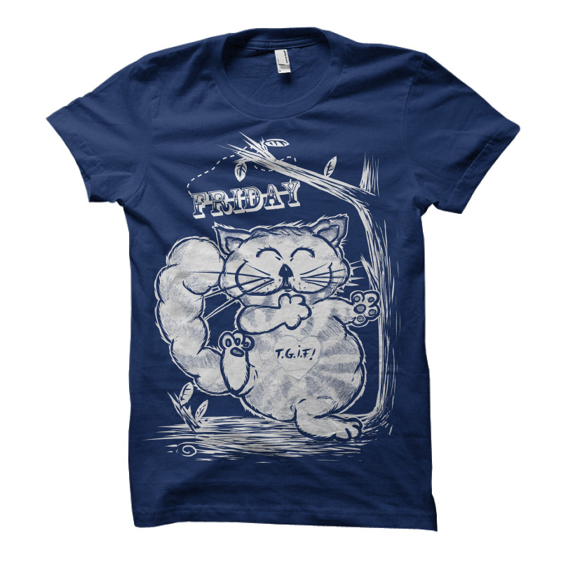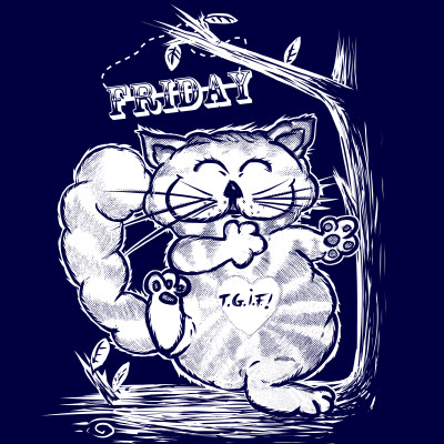 This cat is celebrating the coming of Friday. Everybody's working for the weekend, in the end. The design is based on one of my wife's awesome cat characters.