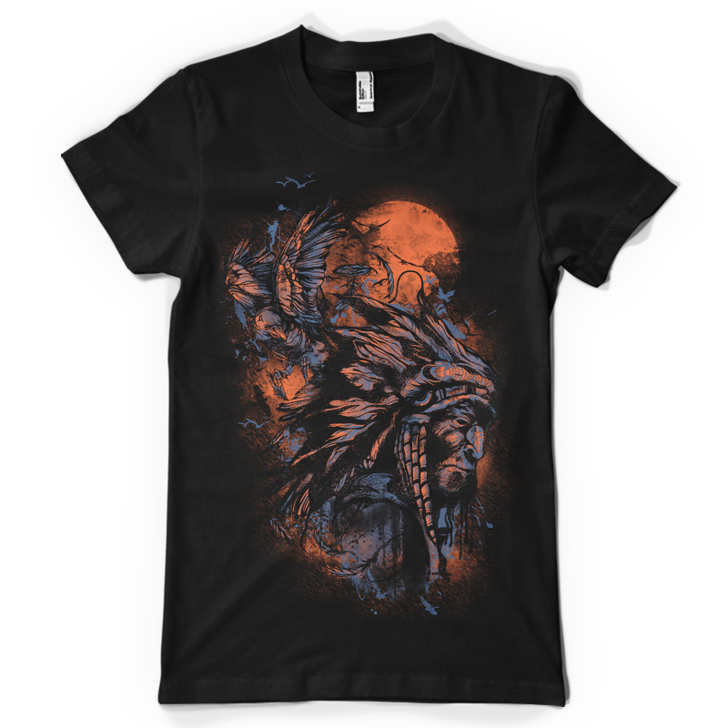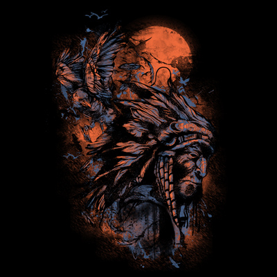 Unique illustration of an elderly chief Indian side by side with a strong flying crow with a background of a shining sun. Using only 2 complimentary colors of orange and blue violet paired with a lot of textures and a unique stroke illustrations.