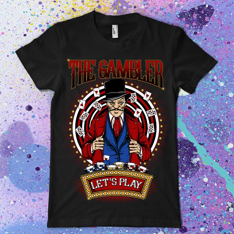 The Gambler t-shirt design features a poker player design detailed screen print now available for Adobe Illustrator, Adobe Photoshop and can be used for digital printing and screenprinting.