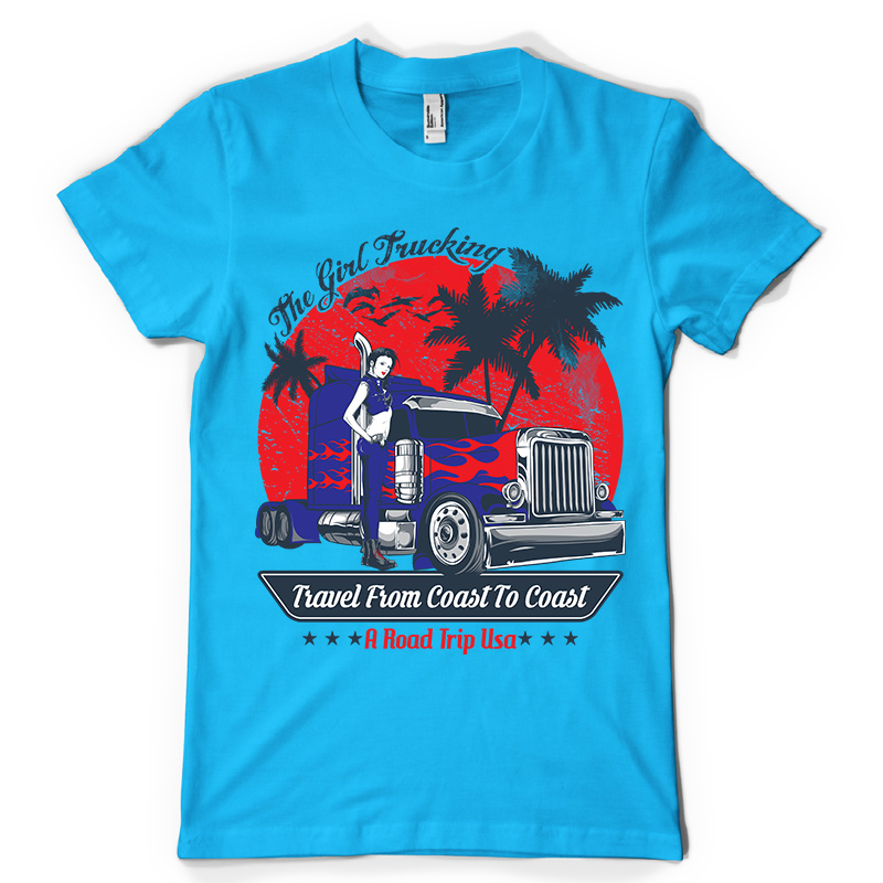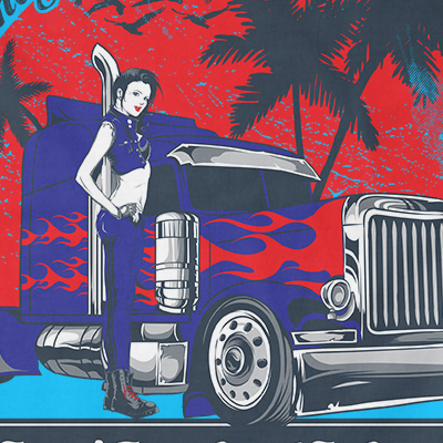 The Girl Trucking design features a Pin Up Driver Truck detailed screen print now available for Adobe Illustrator, Adobe Photoshop and Corel Draw and can be used for digital printing and screenprinting