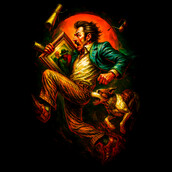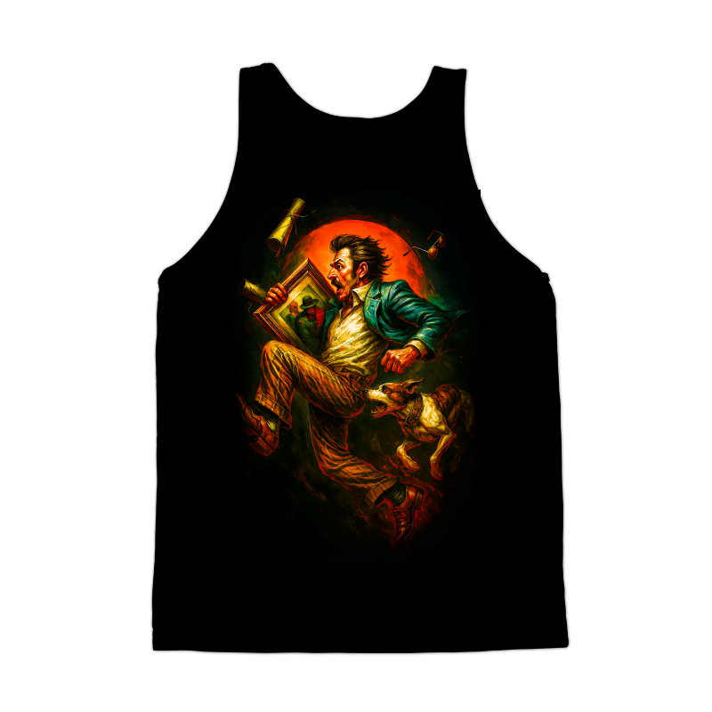 This dynamic illustration depicts a frantic escape scene. A man with a wild expression is running, clutching a framed painting. His attire consists of a green jacket, a partially unbuttoned white shirt, and orange pants, giving him a slightly disheveled appearance. In hot pursuit is a snarling dog, nipping at his heels. The backdrop features a large, ominous red circle, possibly a moon or setting sun, adding to the sense of urgency. The style is reminiscent of comic book art with bold lines and dramatic shading, enhanced by a painterly texture. The composition is highly energetic, capturing a moment of intense action and potential chaos. The color palette is dominated by warm tones, creating a sense of heat and heightened emotion.