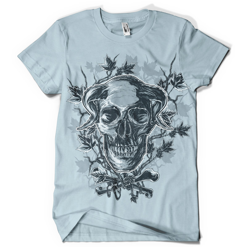 The horned one t-shirt design in vector format, made for screenprinting and digital (DTG) printing, can be used with Adobe Illustrator, Photoshop and Corel Draw. The template can be customized by the designer.