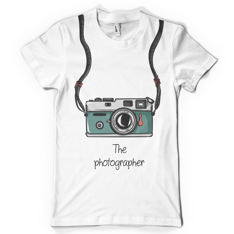 The photographer is an illustration made in Adobe Illustration,featuring a an old camera hanging around the neck,for the photographer type.It can be used on digital printing,screen printing and T-shirt design and it is available in PSD,EPS,AI and PNG format file.
