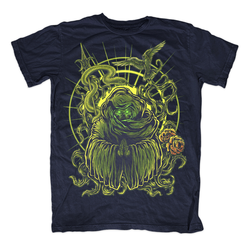 Illustration of dark gothic monk with floral, snake, bird and religious symbol and ornaments. Ready to print on t-shirt.