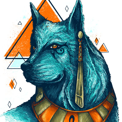 "The Royal" is a unique illustration of the Egyptian God "Anubis" paired with geometric lines using colorful neon colors of teal, gold and orange. This design is hand-drawn which makes it very unique. File contains a PSD file with 17x24 in size with 300 in dpi.