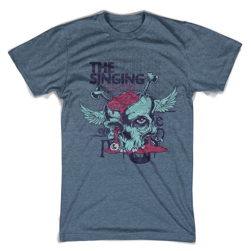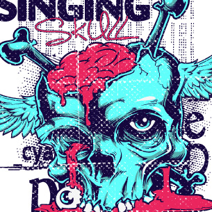 The singing graphic design template in vector format, featuring detailed creepy cranium now available for Adobe Illustrator, Adobe Photoshop and Corel Draw and can be used for digital printing and screenprinting .