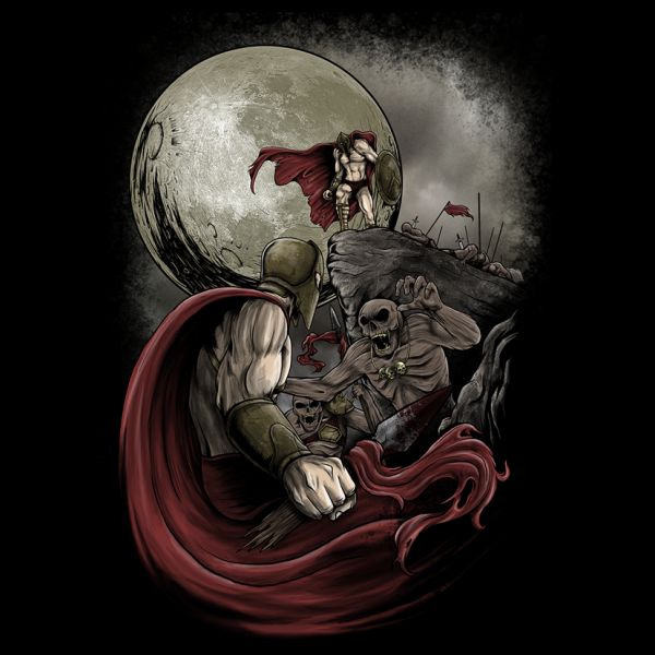 Illustration of the Spartan against the living dead. The epic war between human and demon. This artwork very fit with your band merch. the red color makes it really stand out.