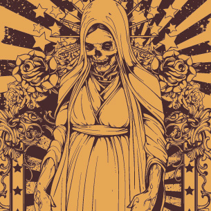 Skeleton woman wearing a cloak on a flourish background