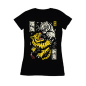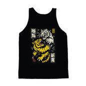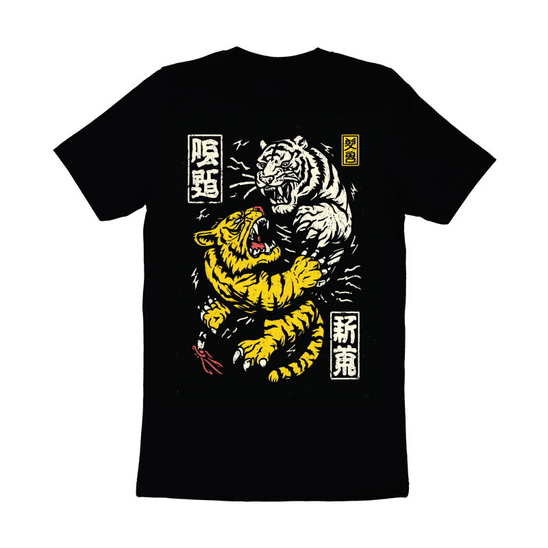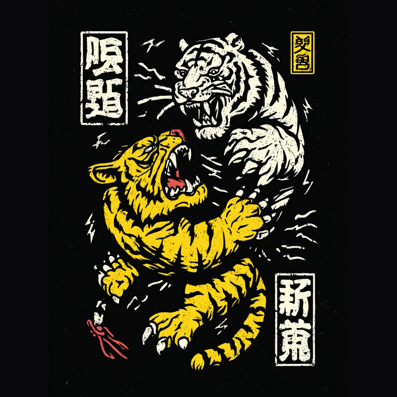 This striking illustration depicts two tigers locked in a fierce battle. One tiger is rendered in a vibrant yellow with black stripes, while the other is a stark white with black stripes, creating a visually arresting contrast. The design incorporates traditional Japanese design elements, including stylized kanji characters in rectangular frames, adding an authentic cultural touch. The overall aesthetic is reminiscent of vintage woodblock prints, with bold lines and a slightly distressed texture. The tigers' snarling faces and powerful claws convey a sense of raw energy and aggression. The composition is dynamic, with the tigers intertwined in a visually engaging manner. The color palette is limited to yellow, white, and black, enhancing the design's impact and creating a bold statement.