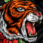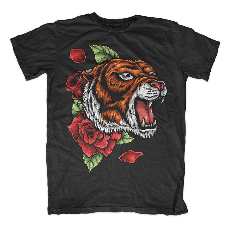 Vector illustration of tiger head with rose in tattoo style drawing. Ready to print on t-shirt.