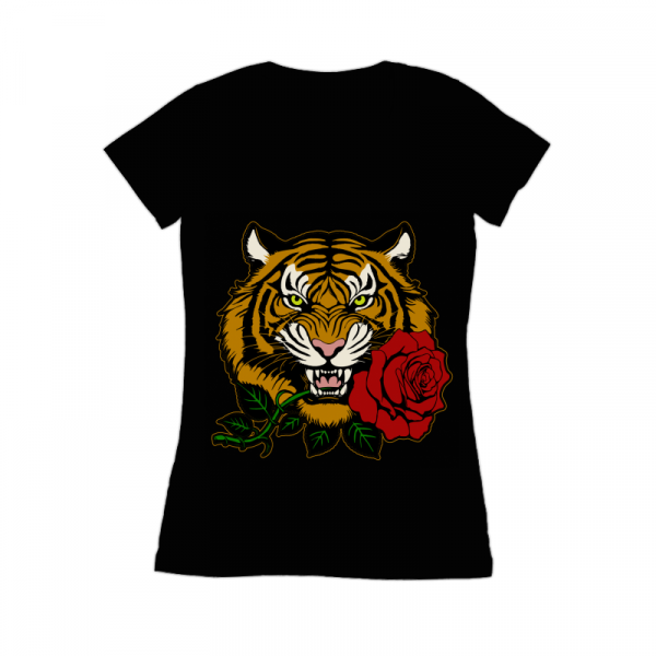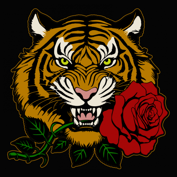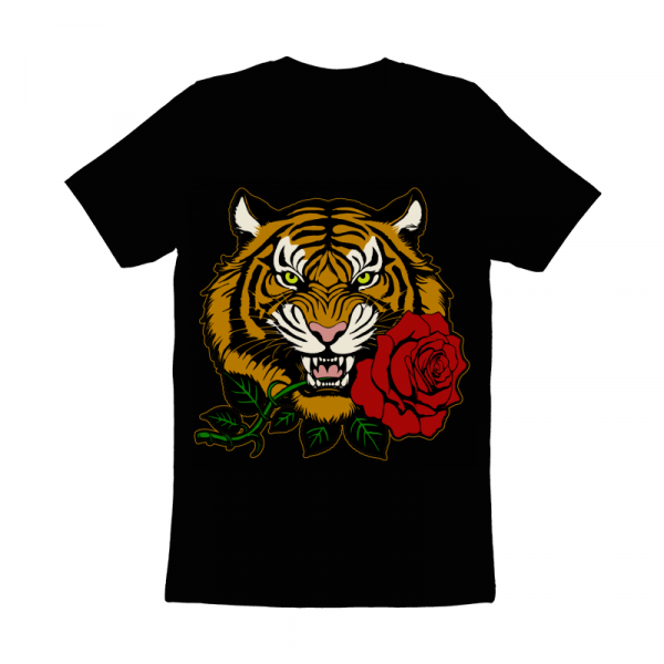 This vibrant and striking illustration features a fierce tiger's head gripping a deep red rose in its mouth. The tiger, with its intense green eyes and bold orange and black striped fur, exudes power and wild beauty. The detailed depiction of the tiger's sharp teeth and determined expression enhances the sense of ferocity and strength. Contrasting with the tiger's fierce demeanor, the rose symbolizes beauty, love, and fragility, creating a captivating juxtaposition. The lush green leaves of the rose add an extra layer of color and detail, making the image even more visually engaging. This artwork is perfect for tattoos, fashion designs, or any creative projects needing a bold and dynamic visual element. The dark background further accentuates the vivid colors of the tiger and rose, making the illustration stand out. Ideal for themes related to nature, wildlife, and the interplay of strength and beauty, this design is sure to capture attention and inspire awe.