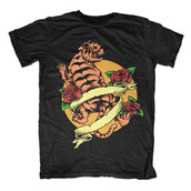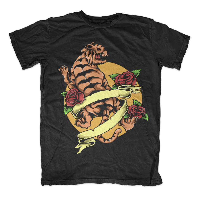 Illustration of tiger vintage tattoo style with floral and empty banner to put text. Ready to print on t-shirt.