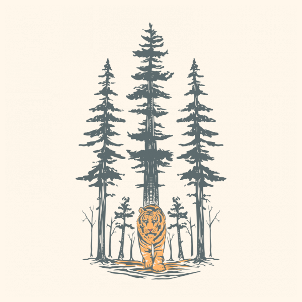 Tiger Woods is a vintage illustration that is suitable for apparel or merchandise about nature, outdoors, wild, wildlife, forest, animal, tiger, lion, trees, jungle, adventure, woods, redwood, national park.