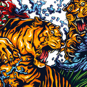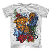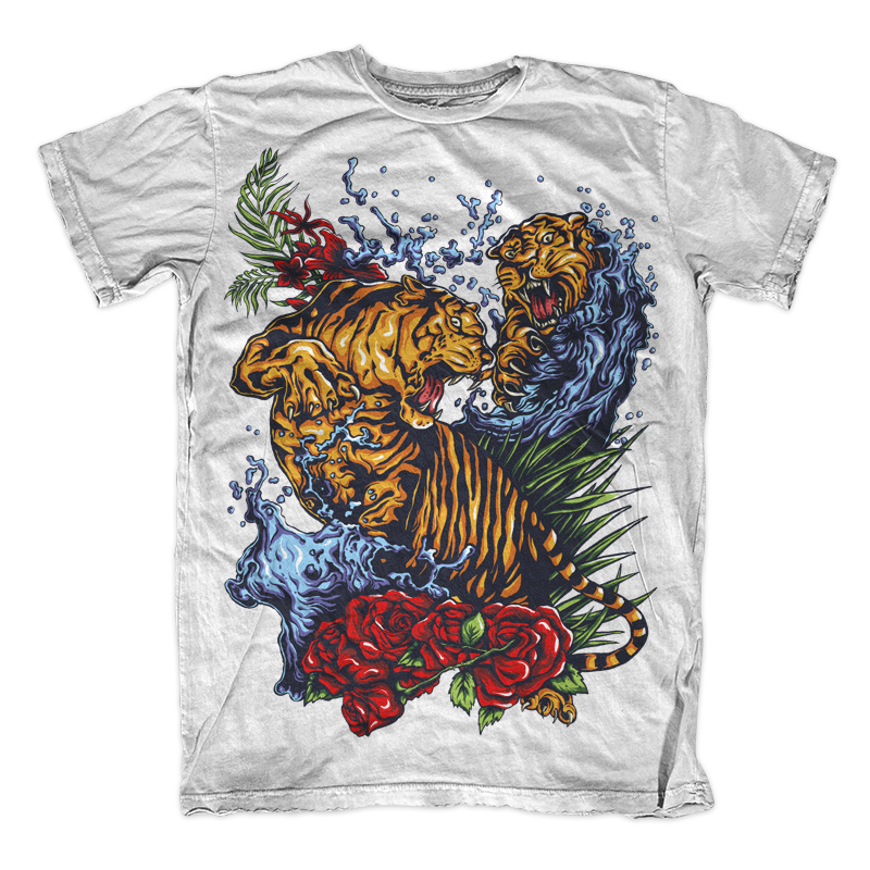 Illustration of tigers fighting in tattoo style with water background and floral. Ready to print on t-shirt.