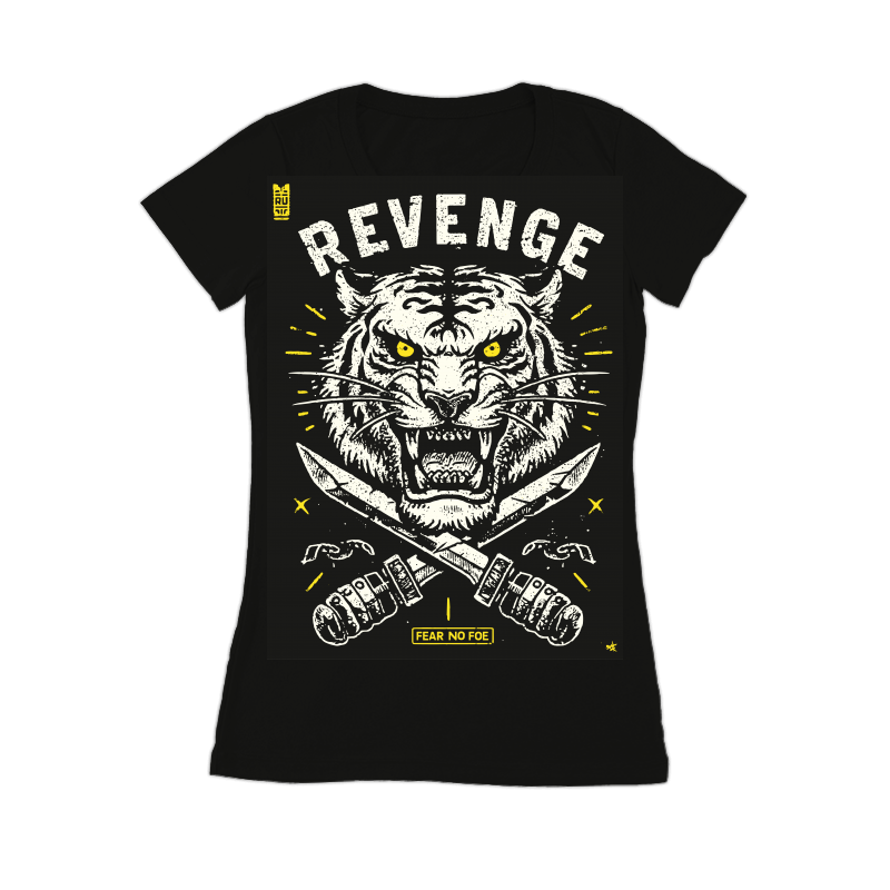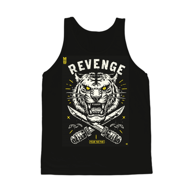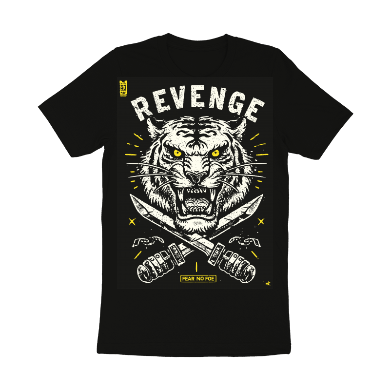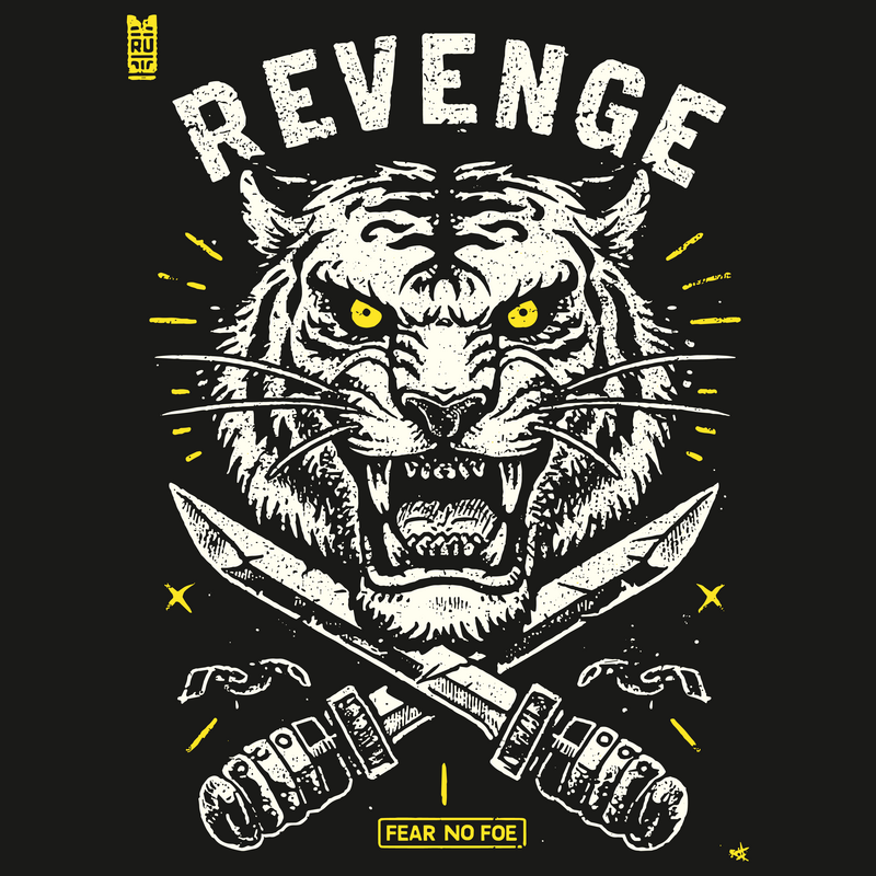 This striking design features a fierce tiger head rendered in a bold, distressed style. The tiger's intense yellow eyes and bared teeth convey a sense of raw power and aggression. Below the tiger, two crossed daggers add to the design's dangerous and rebellious feel. The words "REVENGE" are emblazoned above the tiger in a blocky, distressed font, while "FEAR NO FOE" appears below the daggers, reinforcing the theme of fearless retribution. The design incorporates a limited color palette of black, white, and yellow, enhancing its gritty, vintage aesthetic. Small details like the broken chain links and scattered stars add to the overall sense of chaos and intensity.
