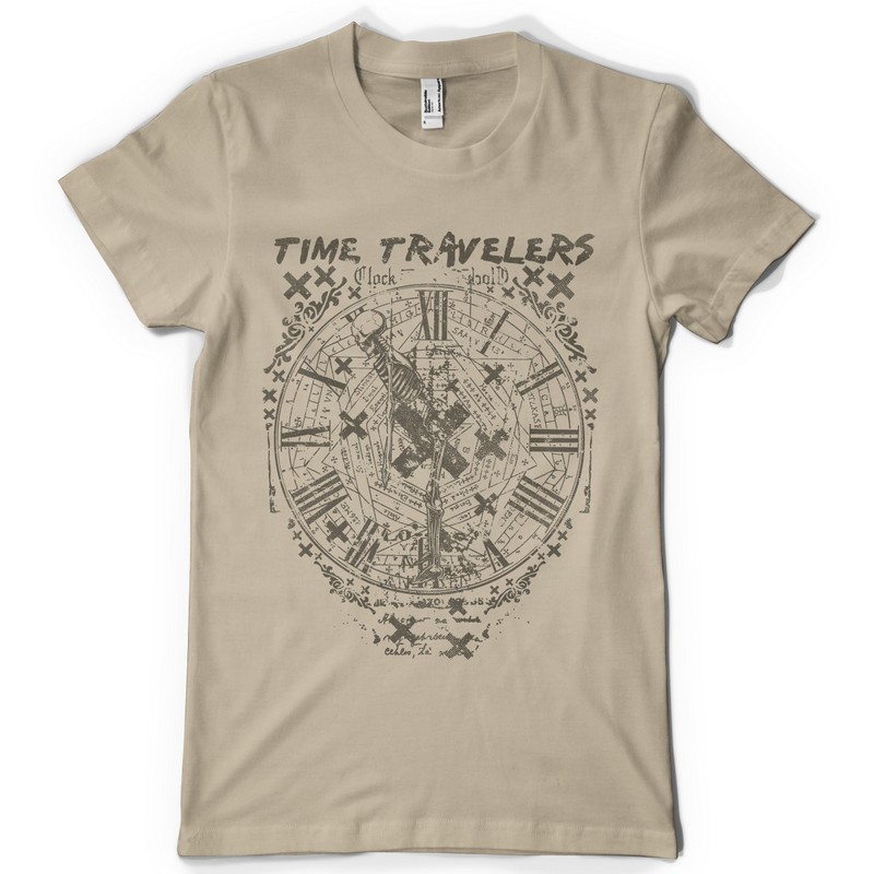 Time travelers graphic design template in vector format, featuring detailed time reverse clock now available for Adobe Illustrator, Adobe Photoshop and Corel Draw and can be used for digital printing and screenprinting .