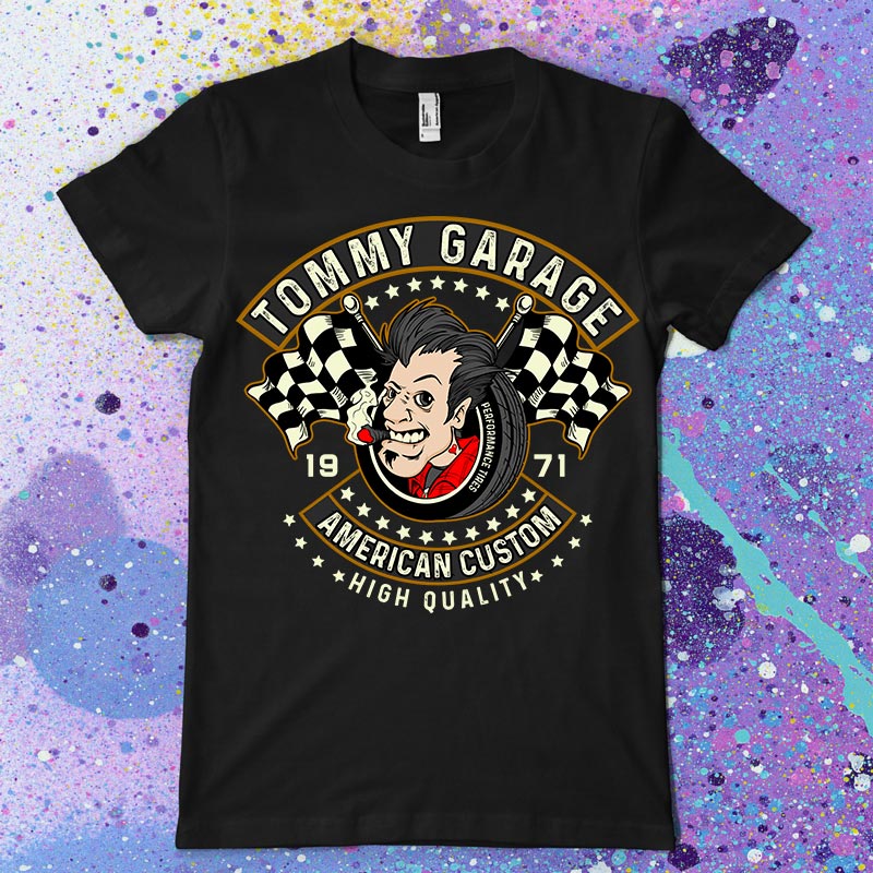 Tommy Garage t-shirt design features a garage service design detailed screen print now available for Adobe Illustrator, Adobe Photoshop and Corel Draw and can be used for digital printing and screenprinting.