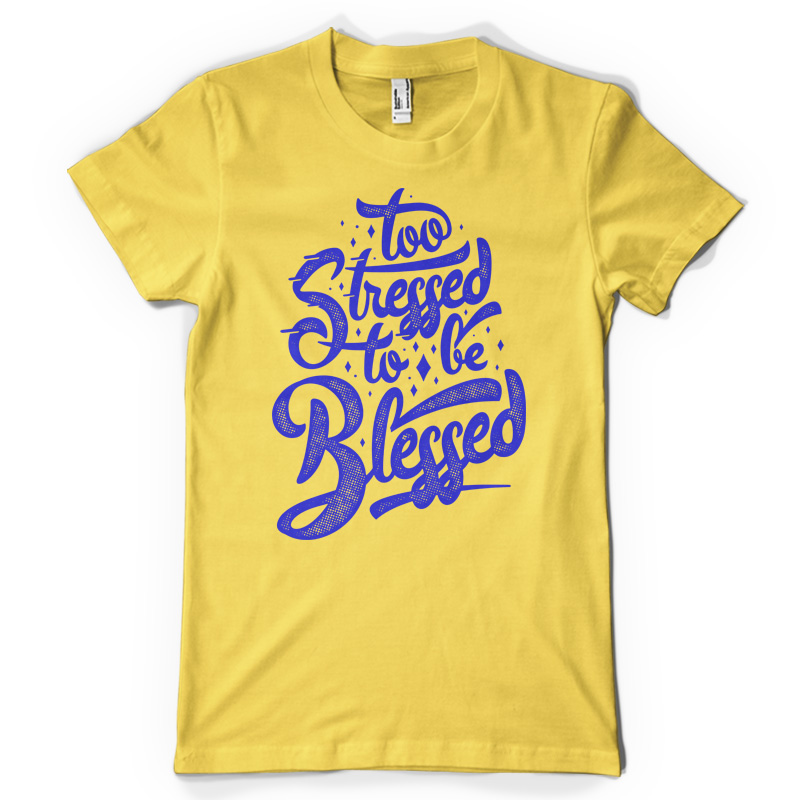 "Too Stressed" T-shirt design featuring typography style quote, with distressed details. The files available are suitable for Adobe Illustrator and Adobe Photoshop and can be used for digital printing and screenprinting.