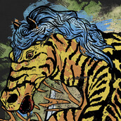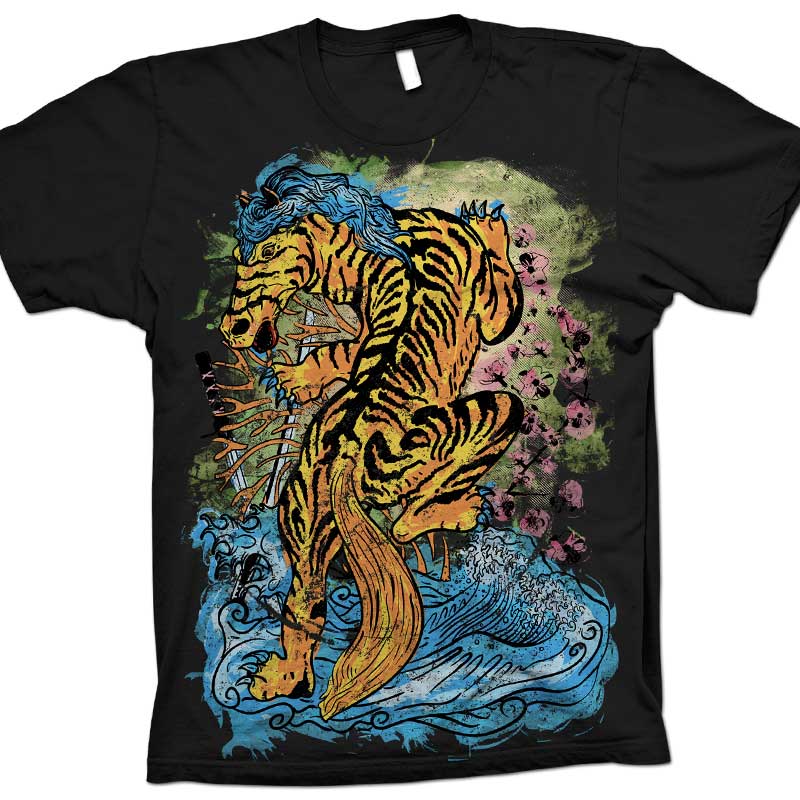 This design is based on a wordplay between the Japanese words Tora (Tiger), Uma (Horse) and the English word Trauma. The design is intended for DTG (Direct to Garment) printing and it is in a .psd format.