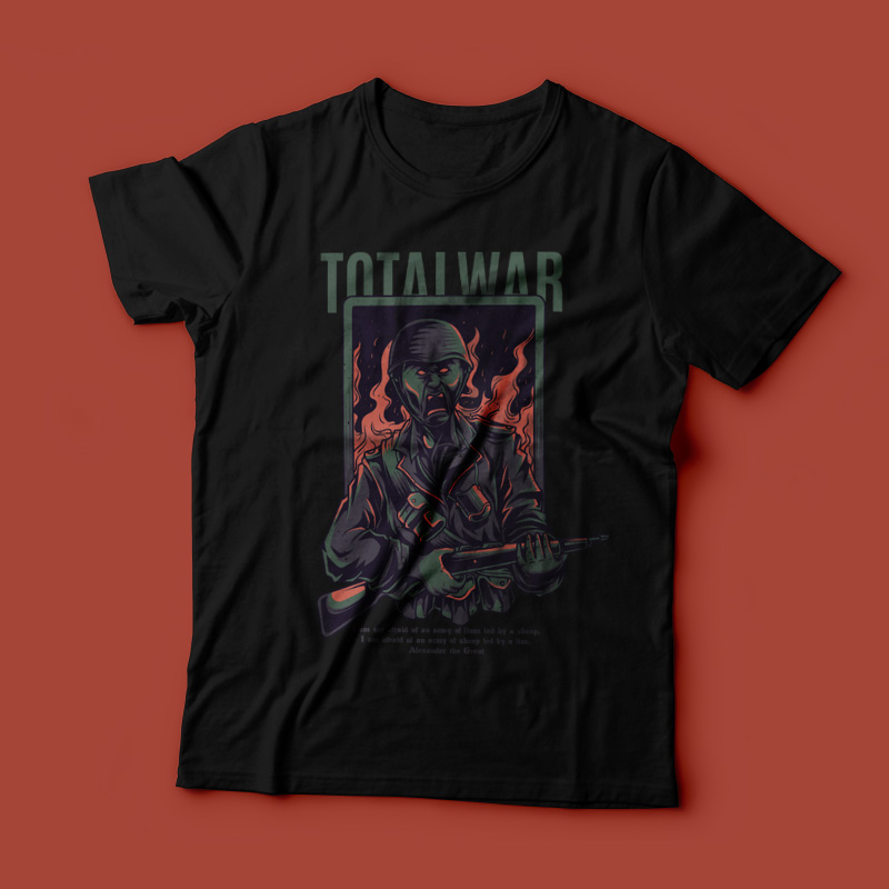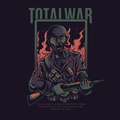 Total War it's a character design that was made in Adobe Illustrator. Based on vector file, easy to resize and edit. File features AI, EPS, and PNG all in zip, CMYK color mode and 4 color. Can be used for digital printing and screen printing.