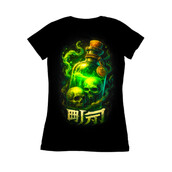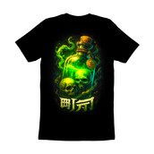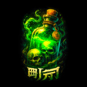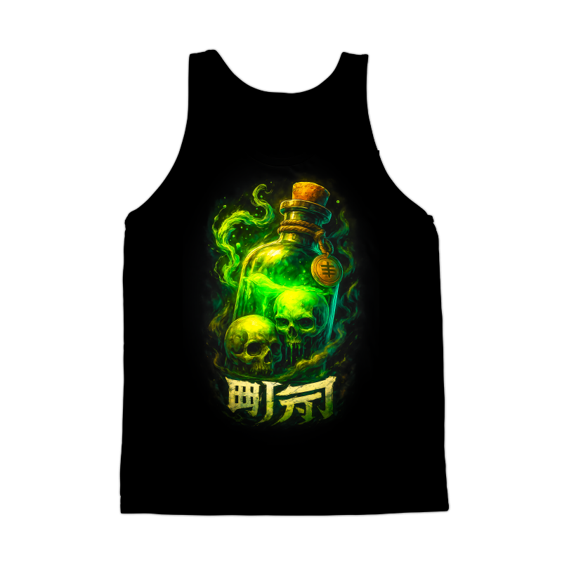 This design features a glowing green potion bottle filled with a mysterious and ominous liquid. Inside the bottle, two skulls float eerily, adding to the design's macabre charm. The bottle is sealed with a cork and adorned with a rope and a pendant, suggesting an ancient or alchemical origin. Green smoke emanates from the bottle, creating a sense of danger and mystique. Below the bottle, stylized characters add an exotic touch, hinting at a magical incantation or a warning. The overall aesthetic is dark and enchanting, blending elements of horror and fantasy. The high contrast and vibrant colors make it visually striking and captivating. Designers could use this image for various projects, including Halloween-themed graphics, fantasy game assets, or gothic-inspired merchandise. It would work well on t-shirts, posters, and digital art. The design's dark and mysterious vibe makes it suitable for products targeting fans of horror, fantasy, and alternative aesthetics. The striking visual elements ensure it will capture attention and stand out.