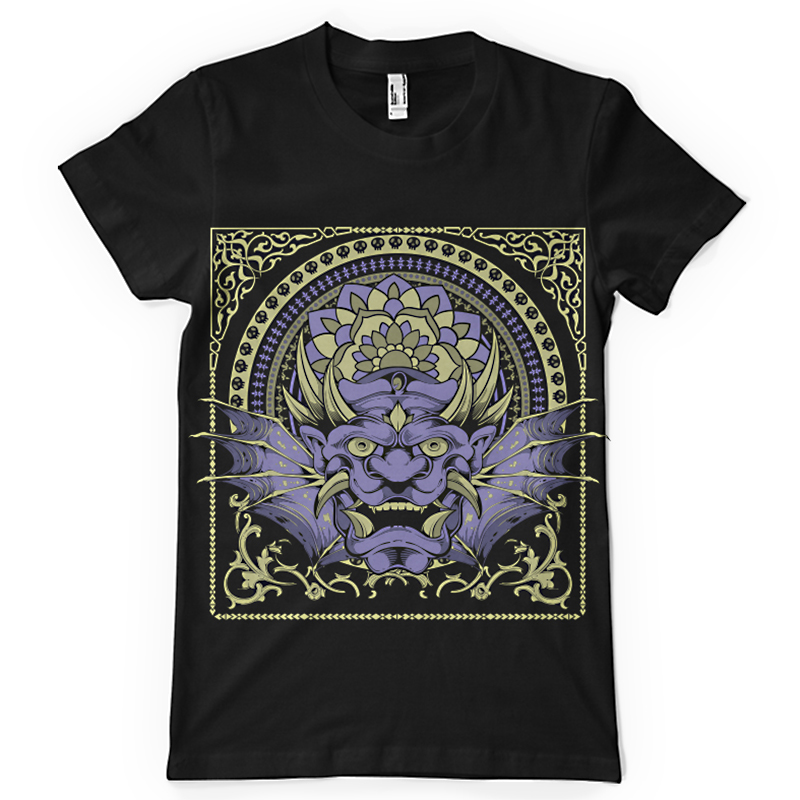 Traditional mask printed t-shirt features a detailed screen print of dragon mask now available for Adobe Illustrator, Adobe Photoshop and Corel Draw and can be used for digital printing and screenprinting . Ready to print or use in anything you want.