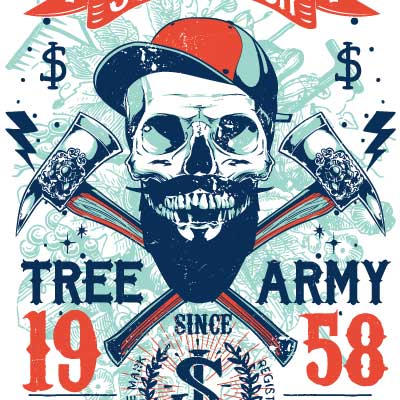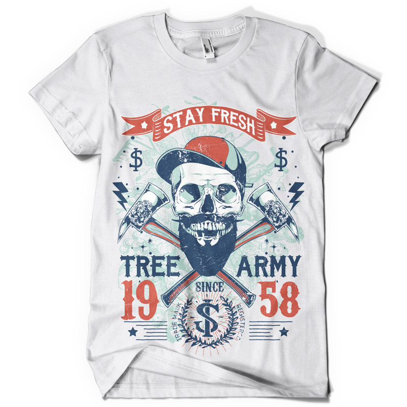 Graphic illustration featuring detailed skull hipster .Tree Army template is available in vector format and can be used for digital printing and screenprinting. The file will be available for Adobe Illustrator, Adobe Photoshop and Corel Draw