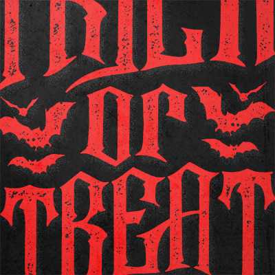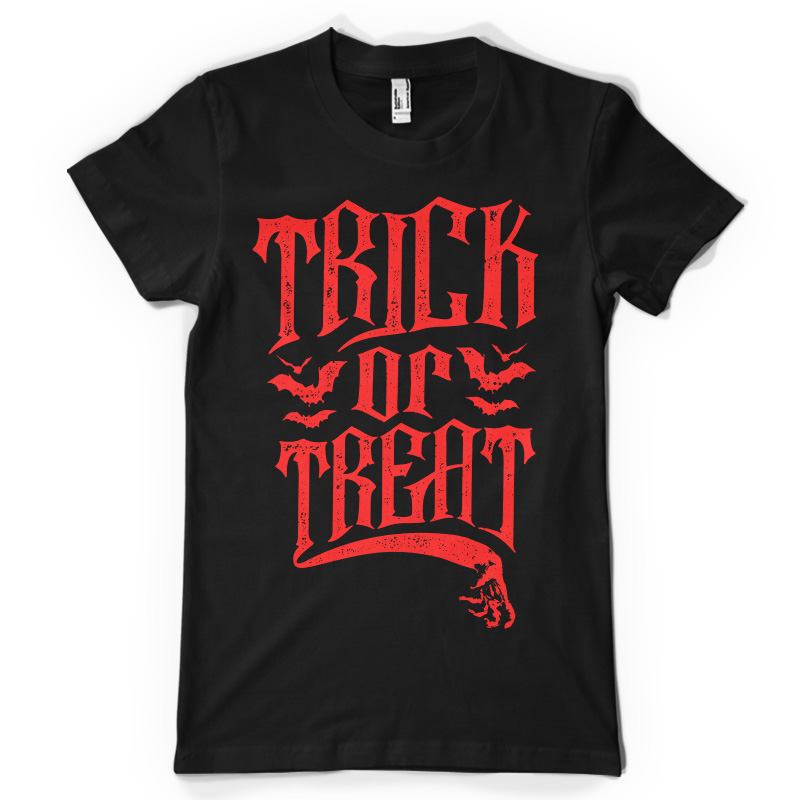 "Trick or Treat" T-shirt design featuring typography style quote, with distressed details. The files available are suitable for Adobe Illustrator and Adobe Photoshop and can be used for digital printing and screenprinting.