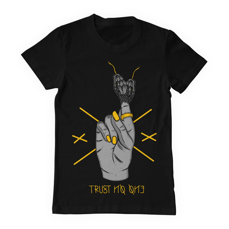 "Trust no one II" design is available in high quality files, such as Ai,EPS, PDF and PNG. Vector files are organized on separate layers and all elements are editable. Can be used for both digital (DTG) and screenprinting.