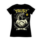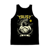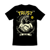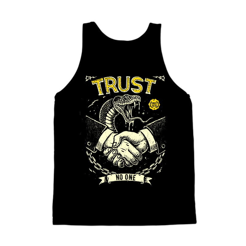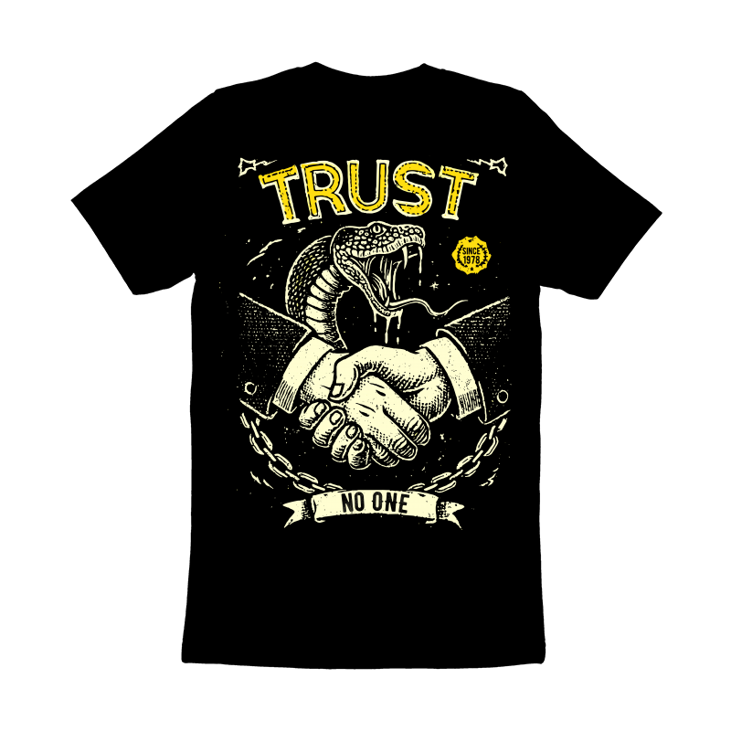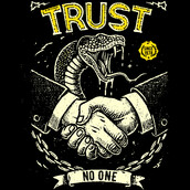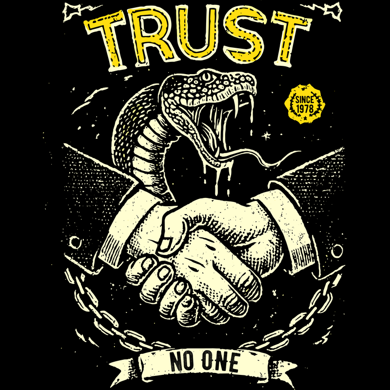This striking design features a handshake between two hands, but with a sinister twist: a cobra emerges from the handshake, its fangs bared, symbolizing deceit and danger. The phrase "TRUST" is emblazoned above, while "NO ONE" is written below, reinforcing the theme of distrust. The design incorporates a vintage, distressed aesthetic, with rough lines and a limited color palette of black and yellow, adding to its edgy and rebellious feel. A chain dangles below the handshake, possibly representing entrapment or broken bonds. The overall composition creates a powerful visual statement about the perils of misplaced trust and the ever-present threat of betrayal.