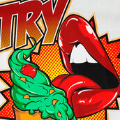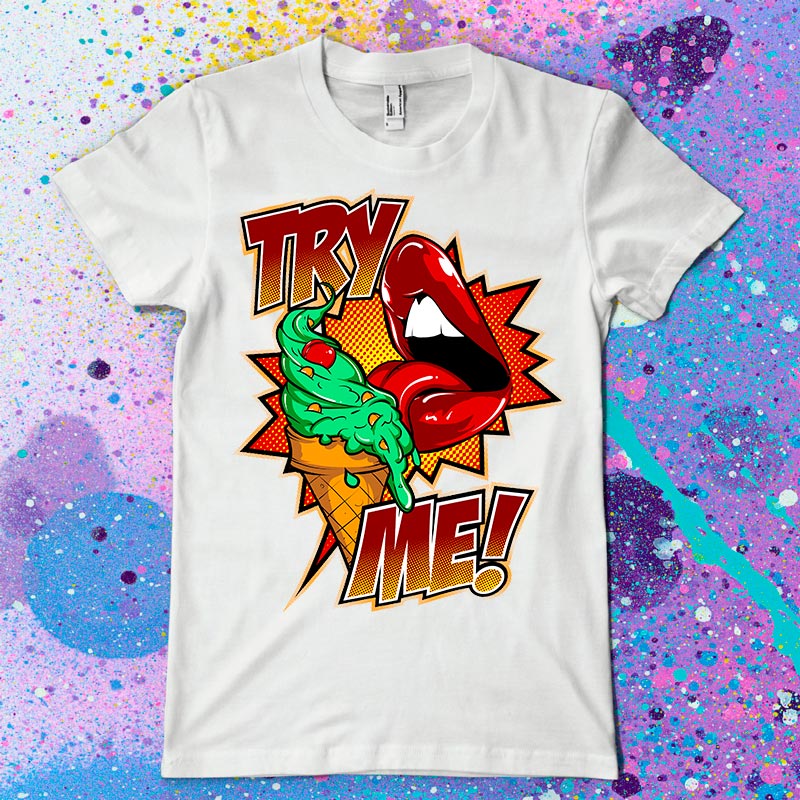 Try Me! -shirt design features a sweet ice cream design detailed screen print now available for Adobe Illustrator, Adobe Photoshop and can be used for digital printing and screenprinting.
