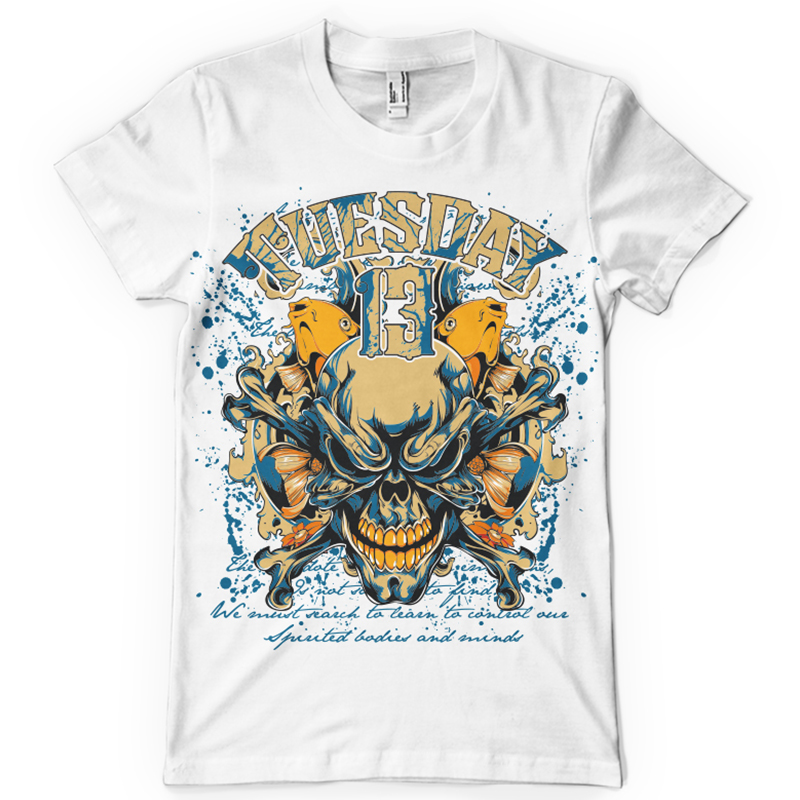 Tuesday printed t-shirt features a detailed screen print of mad skull is now available in EPS format file and can be used for digital printing and screenprinting . Ready to print or use in anything you want.