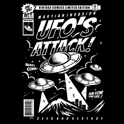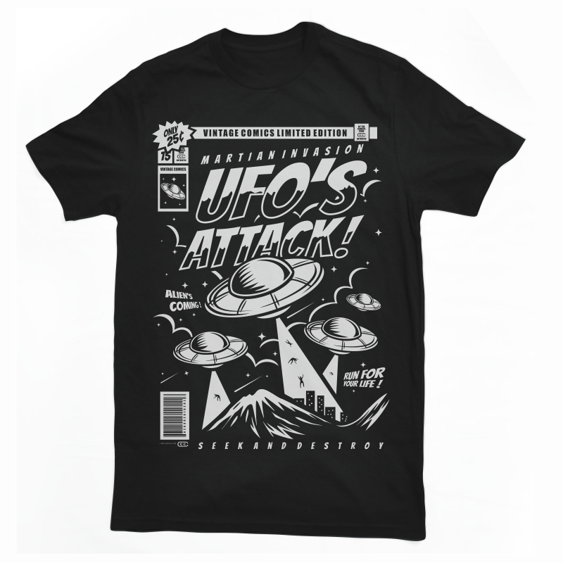 UFO Comic Cover style T-shirt design template with CorelDraw or Adobe Illustrator , 1 Print Color CDR,AI,PSD separated Layers. Can be used for digital printing and screen printing.