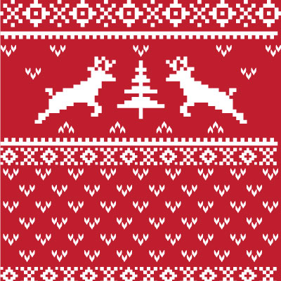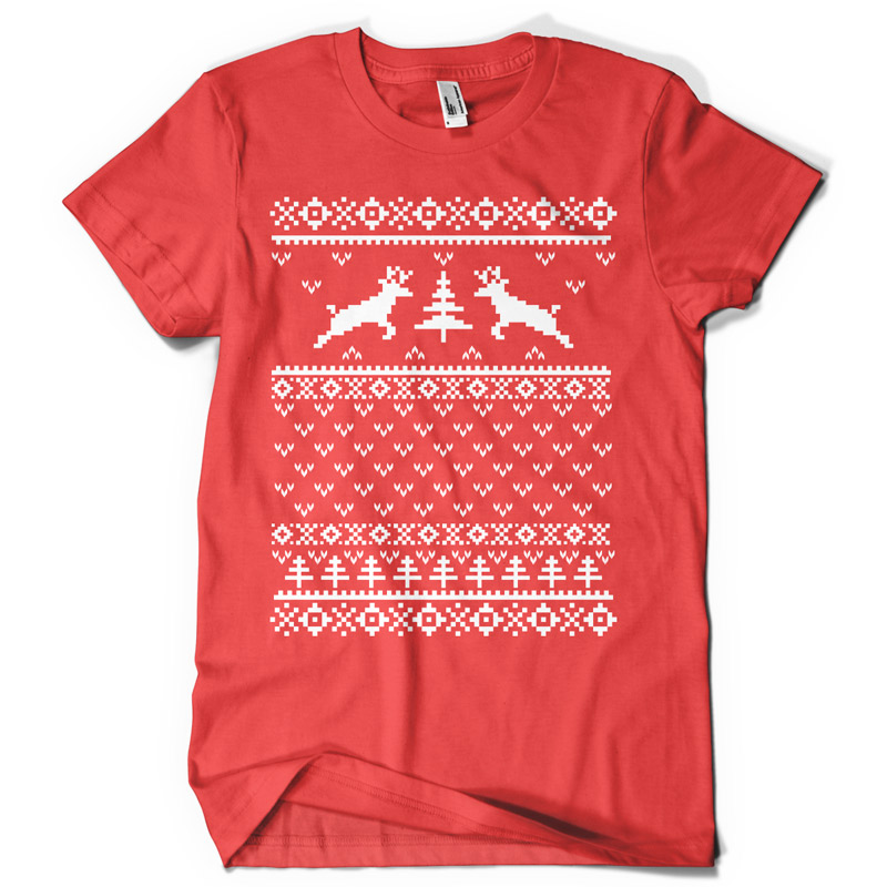 Ugly sweater t-shirt design featuring traditional winter holiday patterns, that imitates the texture of knitted pullovers. The template can be used for digital printing and screenprinting.