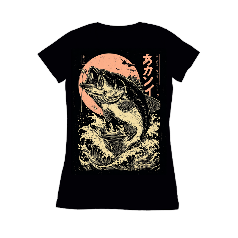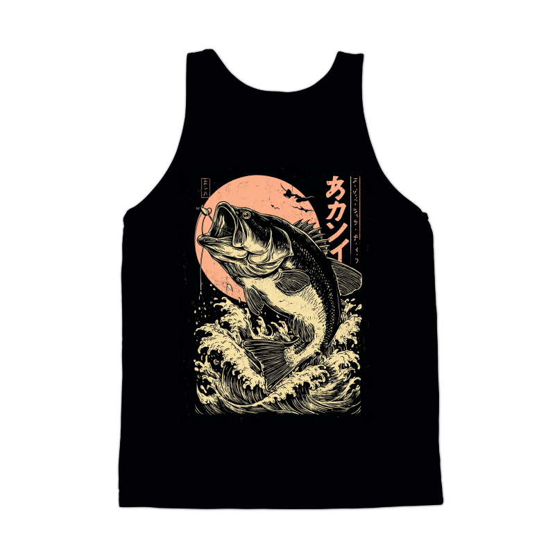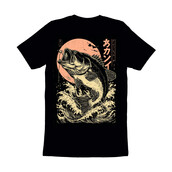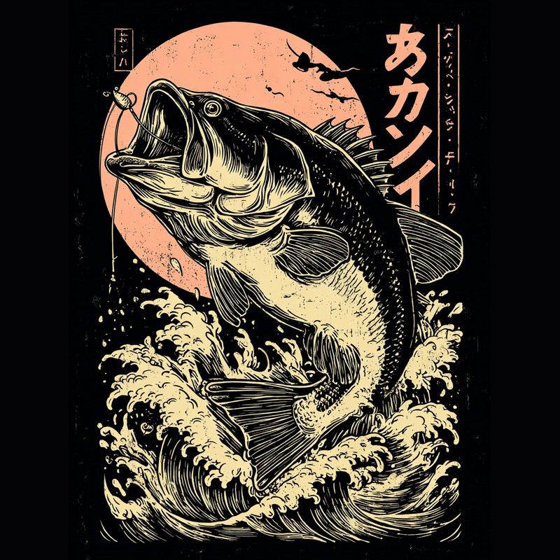 This striking design features a largemouth bass leaping from stylized waves, rendered in a distinctive Ukiyo-e style. The fish is highly detailed with intricate line work, capturing its powerful form and open mouth ready to strike. A fishing lure dangles enticingly. Behind the bass, a faded peach-colored sun adds a vintage touch, while Japanese characters provide an authentic cultural element. The overall composition is balanced and dynamic, blending traditional Japanese art with a modern fishing theme. The design's monochromatic color scheme enhances its classic appeal, making it suitable for a variety of applications.