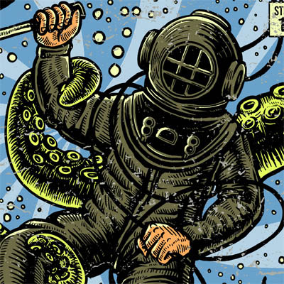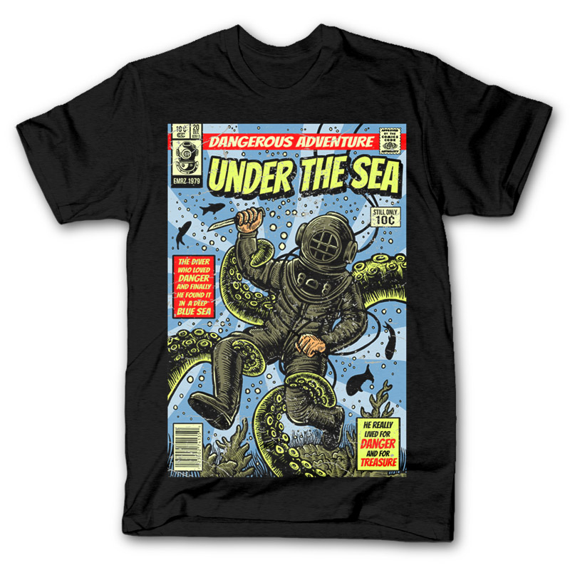 Under The Sea is Artwork with Vintage Classic Comic Cover style , about The Diver who lived for Danger and he found it under the deep blue sea,