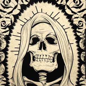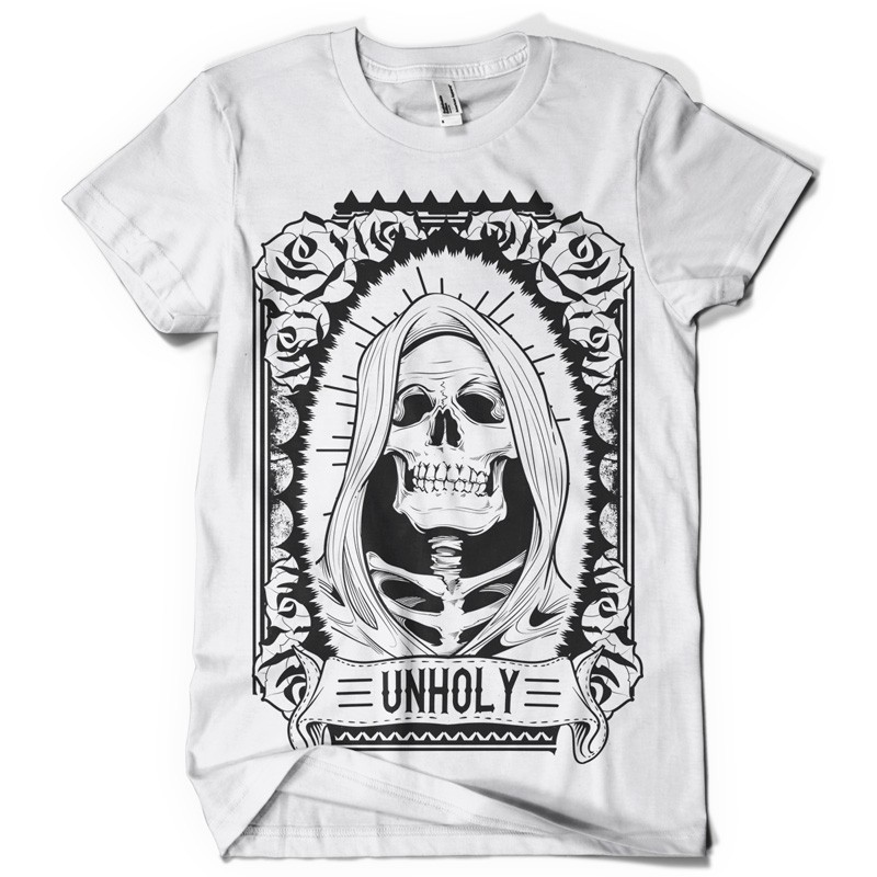 Unholy graphic design template in vector format, featuring detailed creepy saint skull now available for Adobe Illustrator, Adobe Photoshop and Corel Draw and can be used for digital printing and screenprinting .