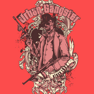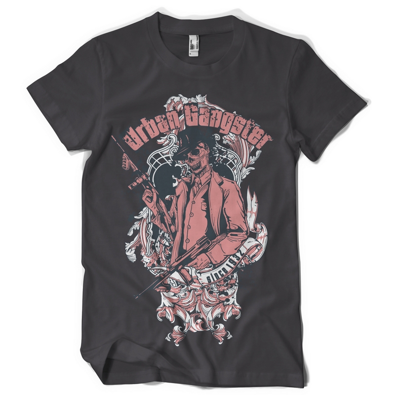 Graphic artwork featuring skull gangster with weapons and flourish details. Urban gangster t-shirt template is available in vector format and can be used for digital printing and screenprinting.The file will be available for Adobe Illustrator,
