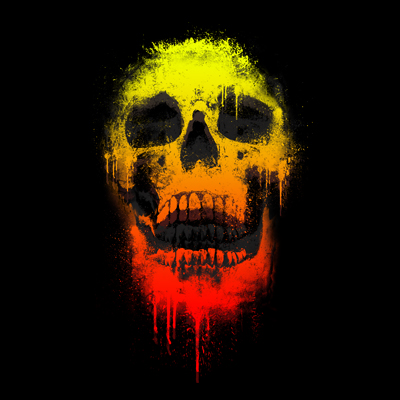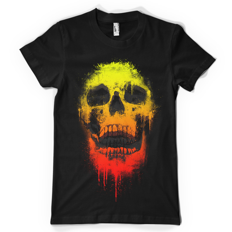 Colorful skull with neon colors of very hot red and a neon yellow which is very attractive on shirt as well as to those looking at the shirt. Its a simple design yet brings out a lot of energy to the shirt because of this design.