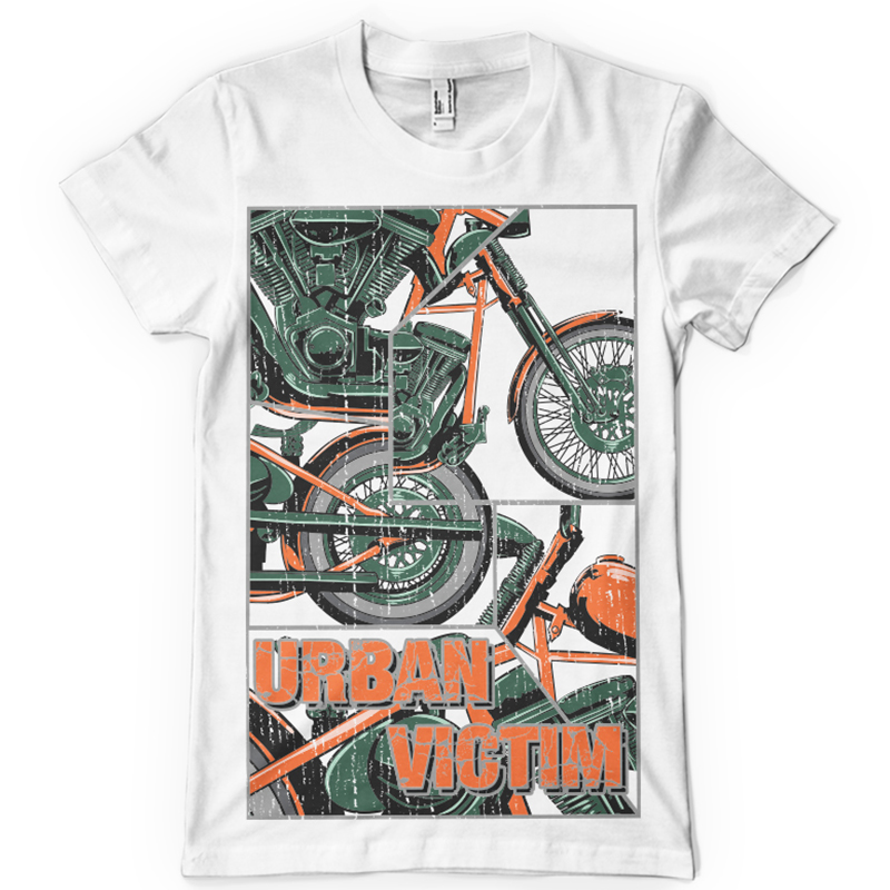 Urban victim printed t-shirt features a detailed screen print of motorcycle body is now available in EPS format file and can be used for digital printing and screenprinting . Ready to print or use in anything you want.