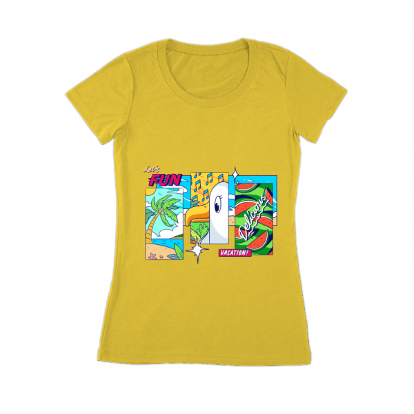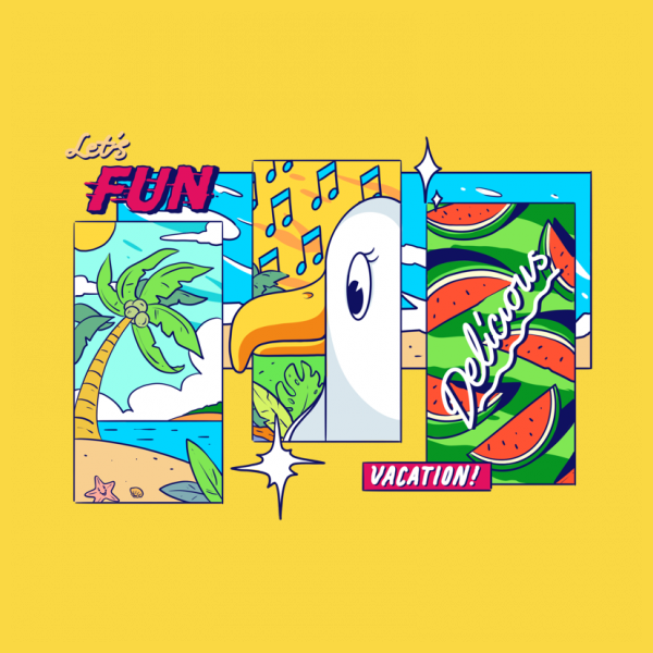 A very light illustration with a view of the beach and the chirping of seagulls accompanied by a piece of watermelon.
