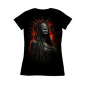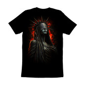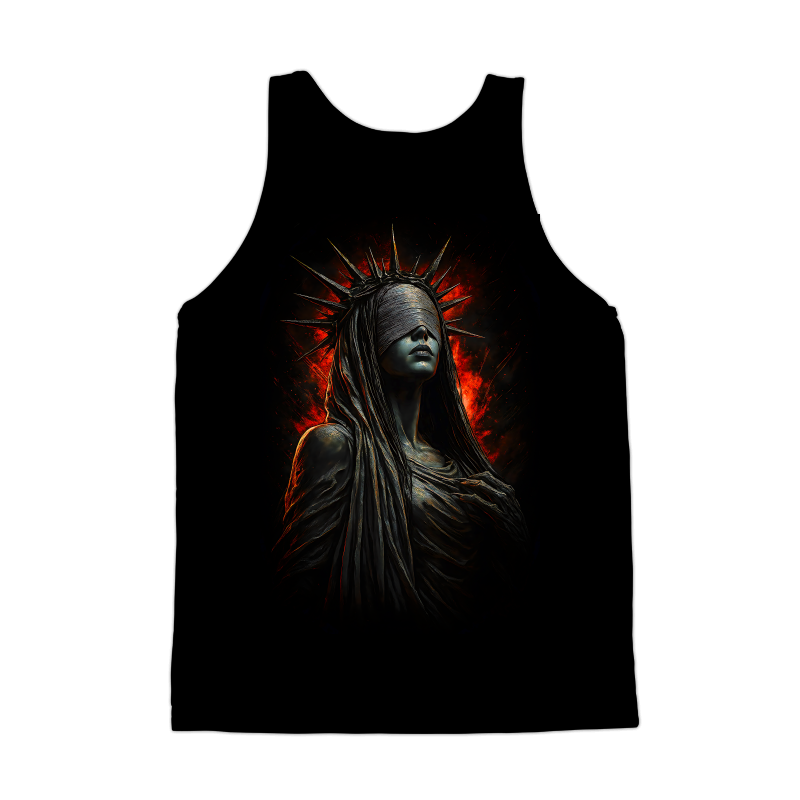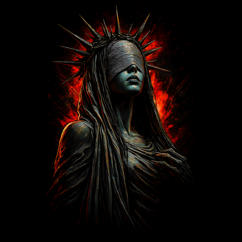 This striking design features a veiled female figure, her eyes concealed by a dark, textured blindfold. A crown of sharp spikes encircles her head, adding an element of danger and mystique. The figure's skin has a cool, almost otherworldly tone, contrasting with the fiery red and orange hues that swirl in the background, suggesting a connection to both the ethereal and the infernal. The drapery that adorns her is rendered with deep shadows and intricate folds, giving a sense of weight and realism. The overall composition evokes a sense of ancient prophecy, dark fantasy, or even a gothic interpretation of religious iconography. The contrast between light and shadow is dramatic, enhancing the emotional impact of the image. Designers could use this image for album art, book covers, or even tattoo designs. Its dark, gothic aesthetic would appeal to fans of horror, fantasy, and alternative subcultures. It could also be incorporated into posters, apparel, or other merchandise. The strong visual impact of the design makes it highly versatile.