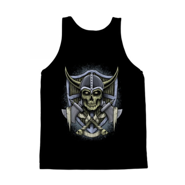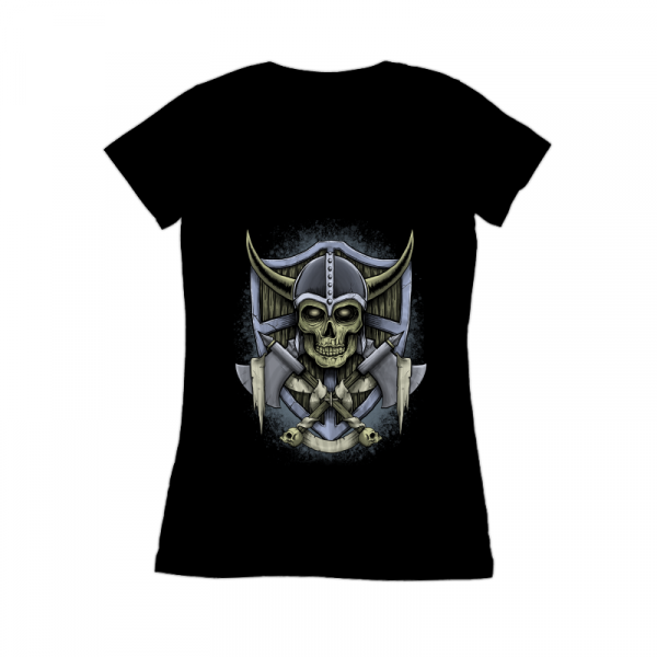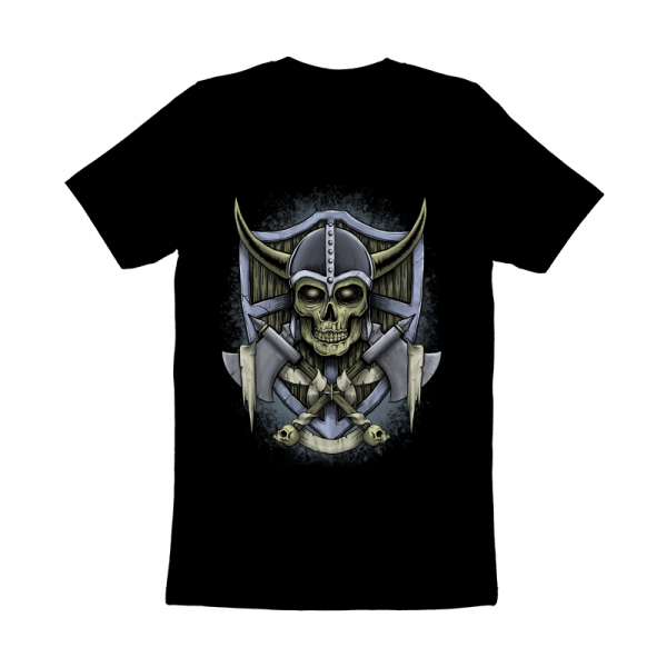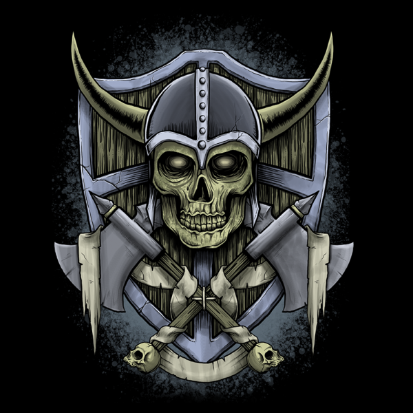 Illustration of Viking skull with ax and shield, made with adobe photoshop. Fit with biker merch, band merch, rock music festival poster, and tattoo design.