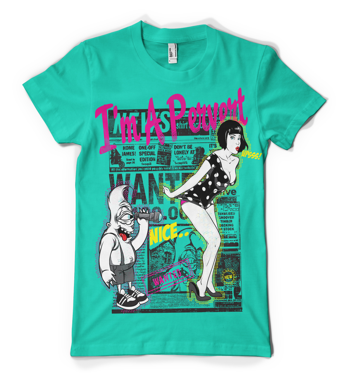 Voyeur t-shirt design features a detailed screen print of sexy retro girl and a creature now available for Adobe Illustrator, Adobe Photoshop and Corel Draw and can be used for digital printing and screenprinting .